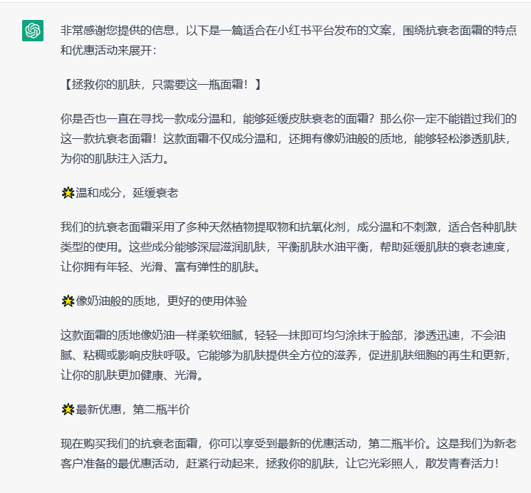 接著,小編讓ChatGPT為一款抗衰老面霜寫一篇文案,同時給到諸如“成分溫和、延緩皮膚衰老“等信息,并且要求ChatGPT結合小紅書的平臺特點。